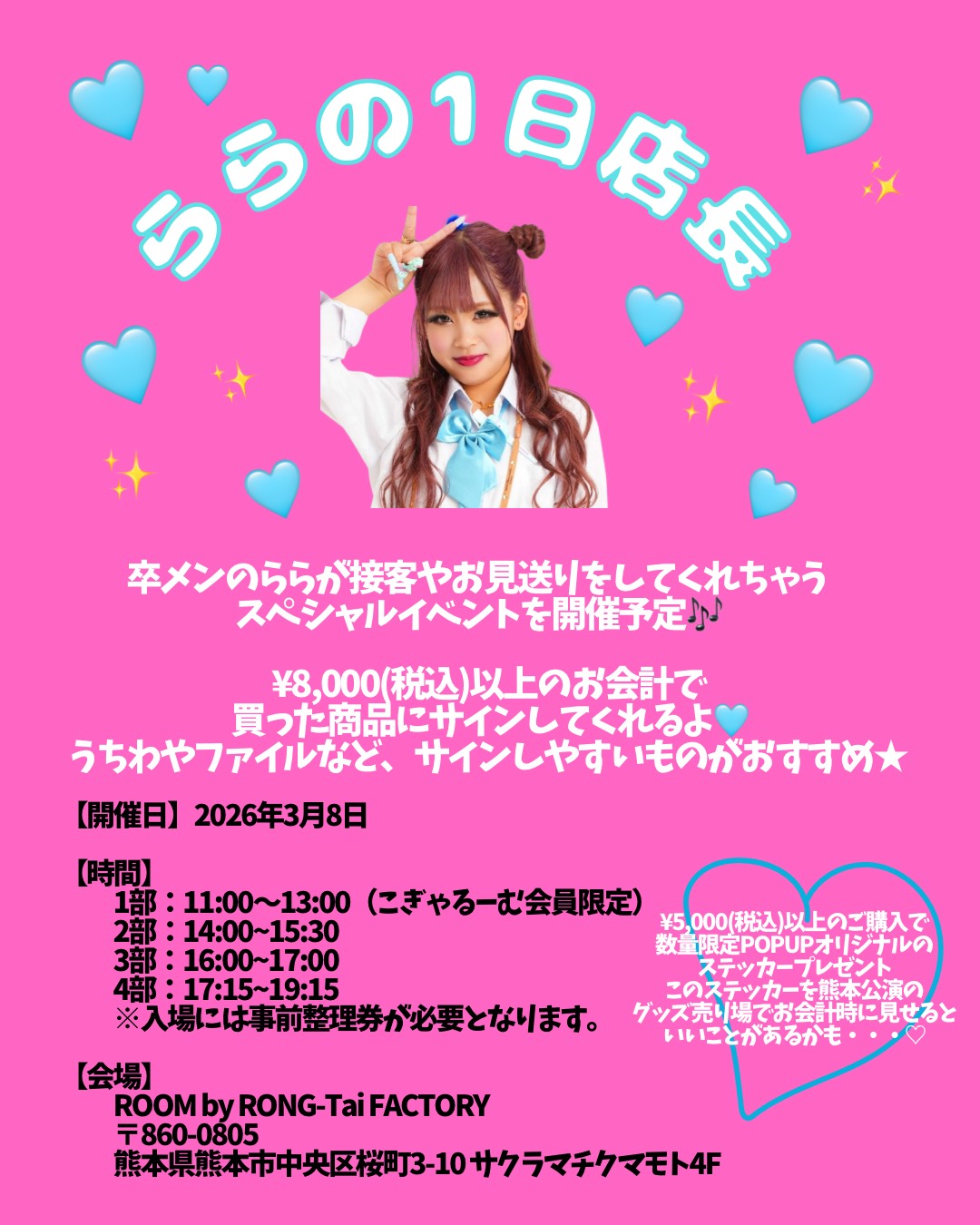 初日の3月8日には、熊本出身の卒業メンバー「らら」が接客やお見送りをしてくれるスペシャルイベントを開催します! さらに、まだ非公開の新メンバー1人も参加予定という見逃せない内容になっています!